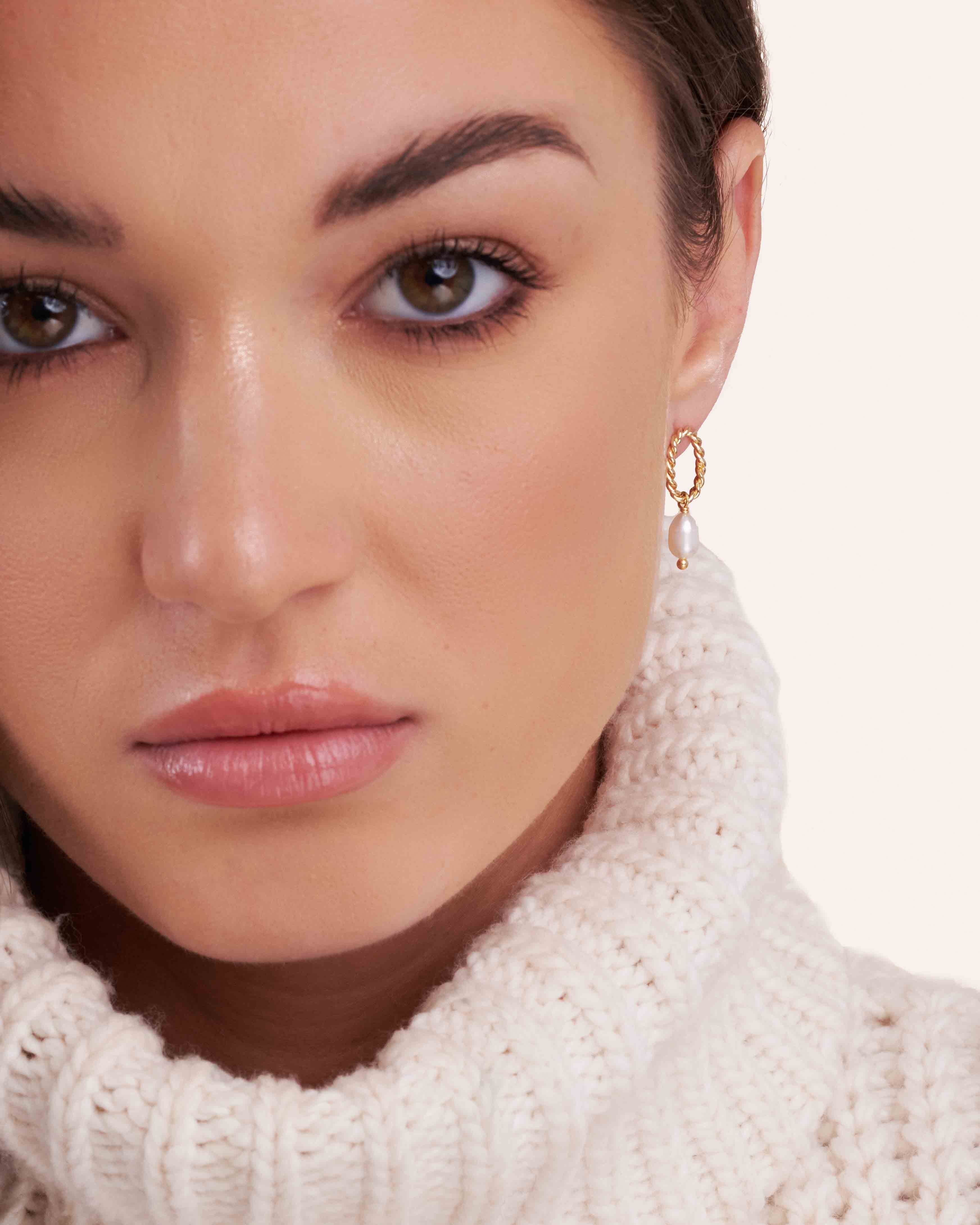 Boucles d'oreilles ovales torsadées plaqué or accompagnées d'une perle de culture allongée. Accumulable avec d'autres boucles d'oreilles de nos collections.