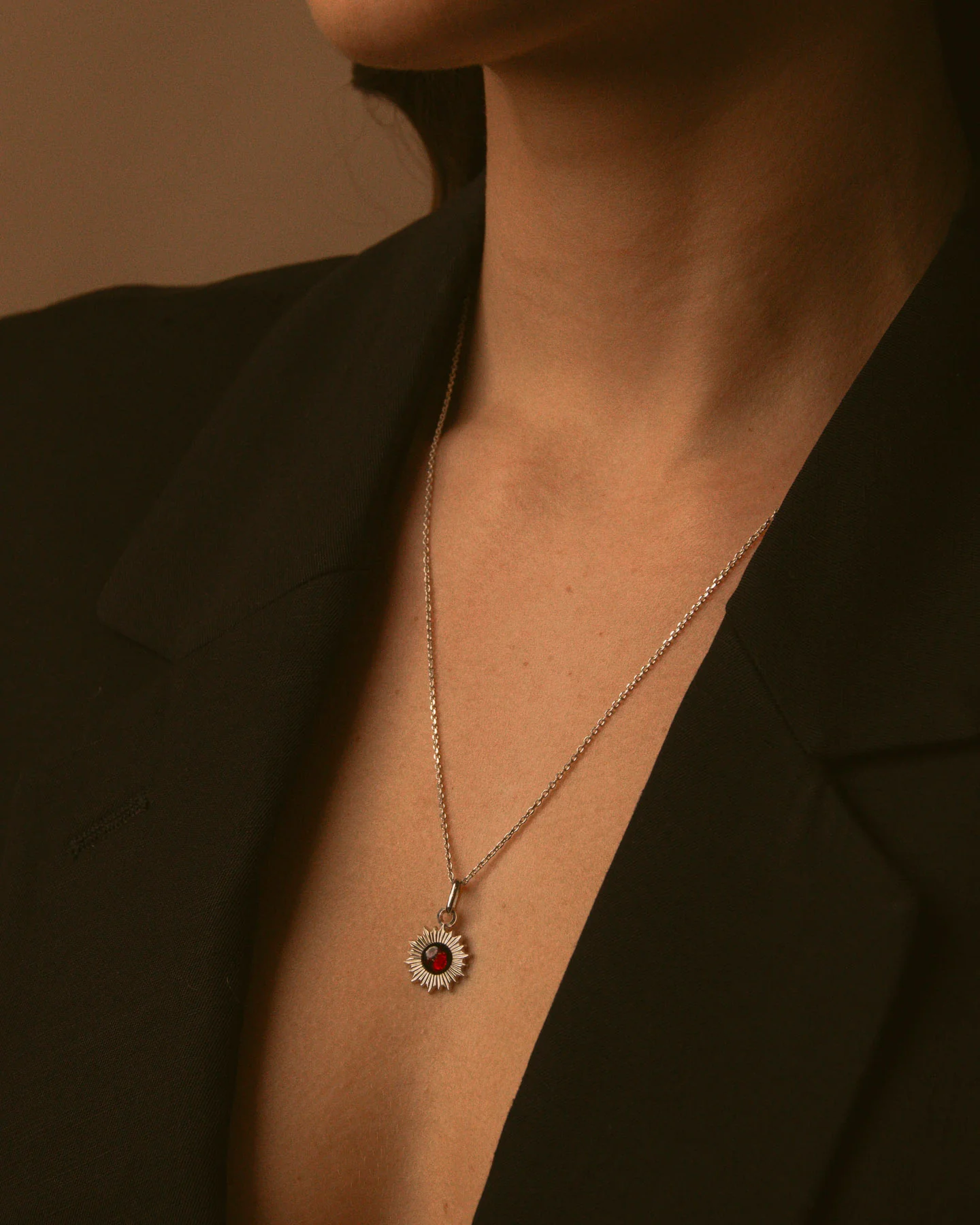 Pendentif au design soleil composé d'une petite pierre de grenat, pierre de naissance du mois de janvier, insérée dans un cabochon en argent.